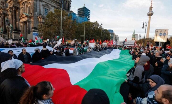 مظاهرات في برلين ومدن ألمانية أخرى للمطالبة بوقف ما وصفه المتظاهرون بالإبادة الجماعية بحق الفلسطينيين في قطاع #غزة، وتنديدا بالدعم الحكومي الألماني لإسرائيل